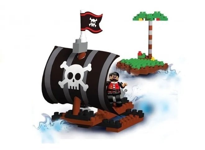Contiene 78 piezas para armar una balsa Pirata junto a la isla, para jugar y divertirse junto a los muñecos articulados.