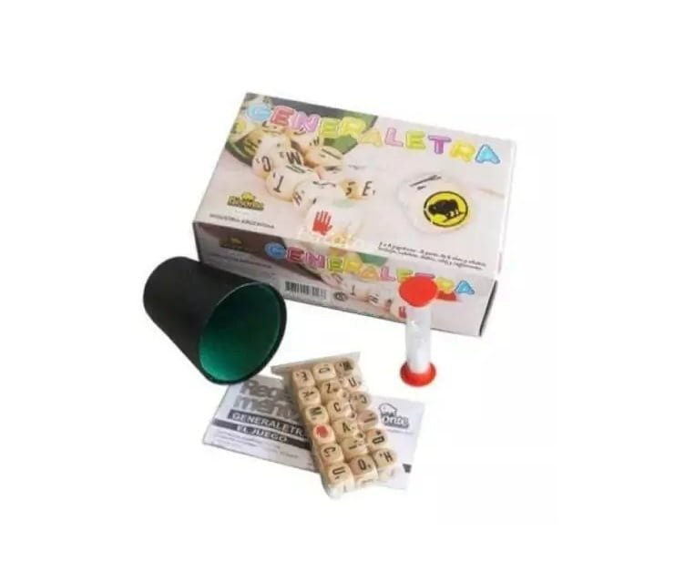 Contiene: 1 cubilete, 1 reloj de arena 18 dados Objetivo: en el tiempo que dure el reloj, hay que formar la mayor cantidad de palabras posibles con los dados de madera